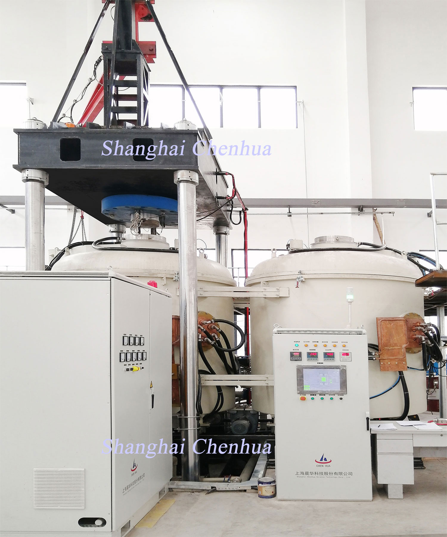 采用雙爐體一壓機(jī),減少設(shè)備的占地和投資,提高了生產(chǎn)效率。系統(tǒng)由二爐體、一套伺服壓機(jī),一套真空系統(tǒng)、一套中頻電源(可選擇IGBT),系統(tǒng)配有起吊裝置,方便模具吊裝。